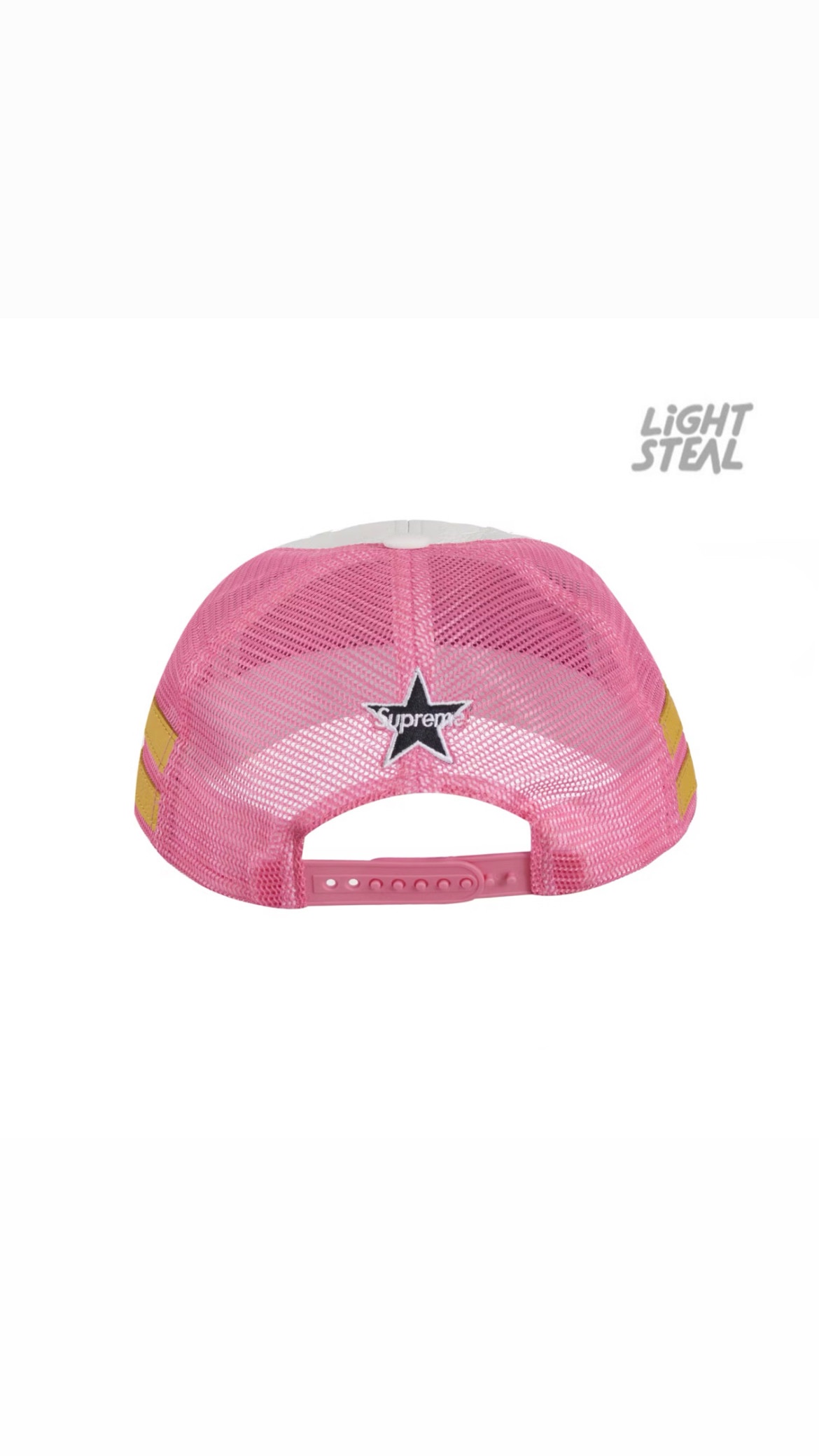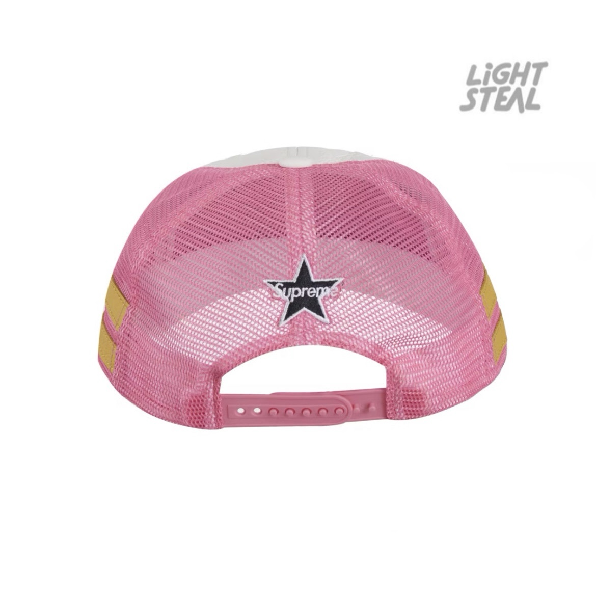 Questa versione presenta un pannello frontale in pelle bovina bianca (cowhide leather), con retro in mesh per ventilazione, chiusura snapback regolabile e patch Supreme in twill applicata frontalmente.